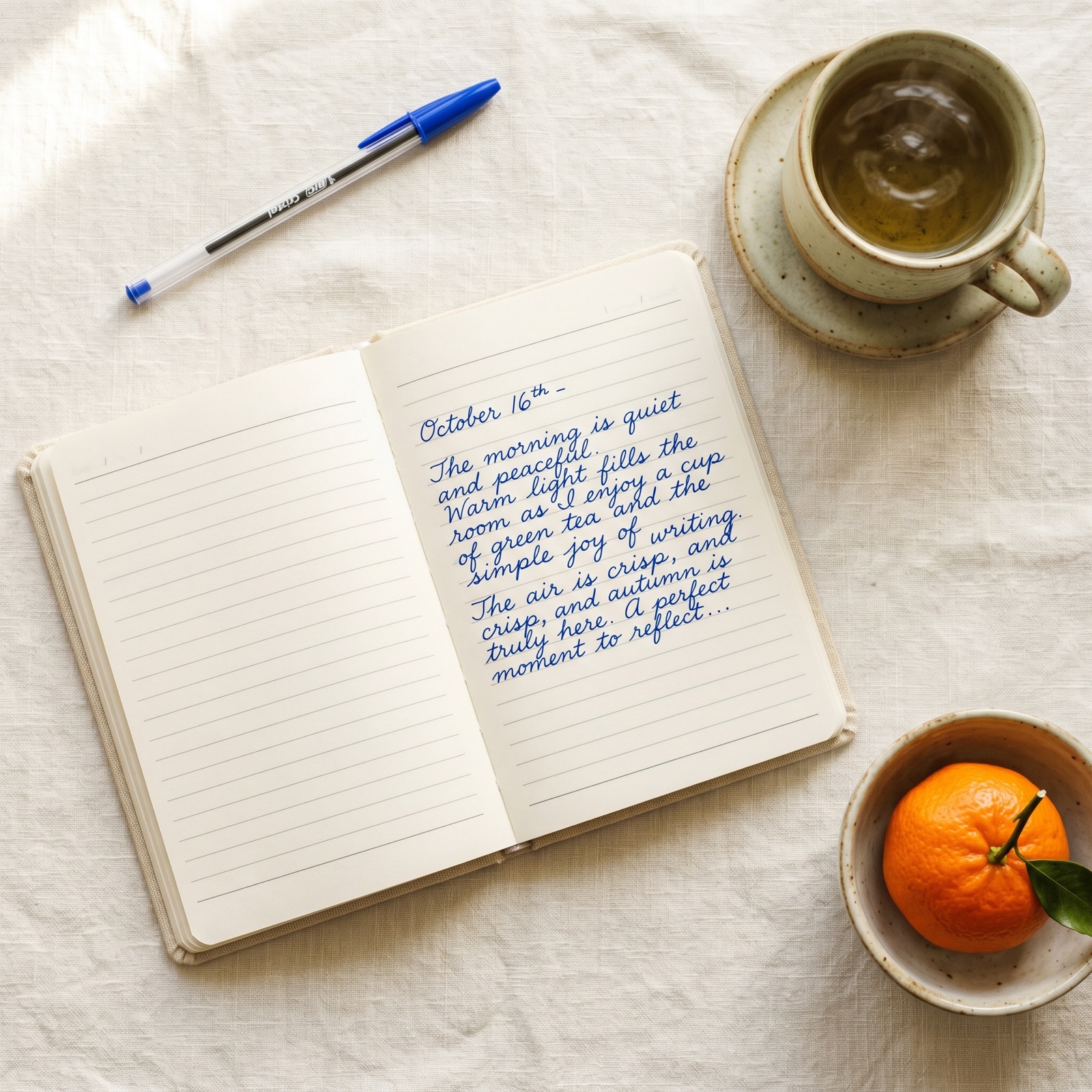 Diário aberto com xícara de chá e mexerica em mesa de madeira