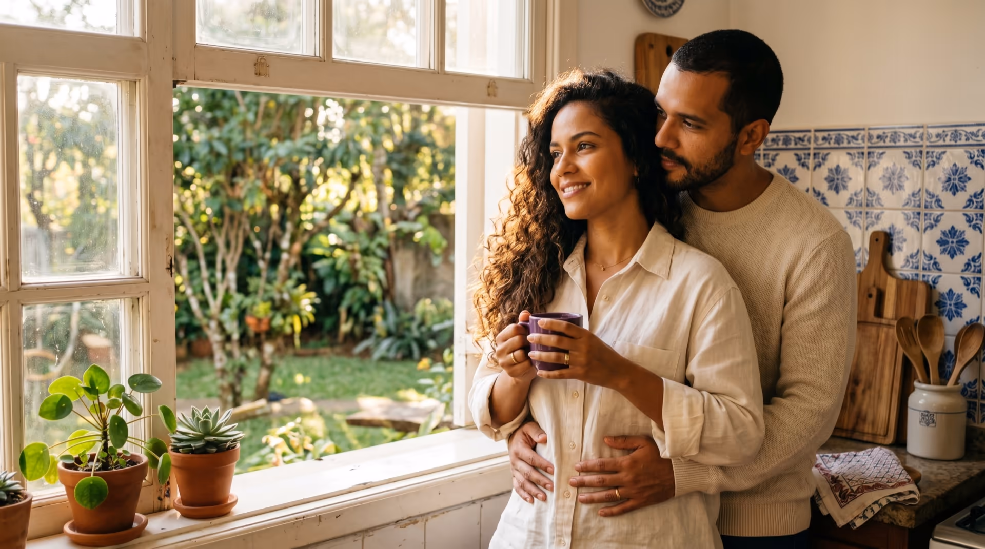 Casal abraçado em um sofá cream com almofada coral, momento de confiança